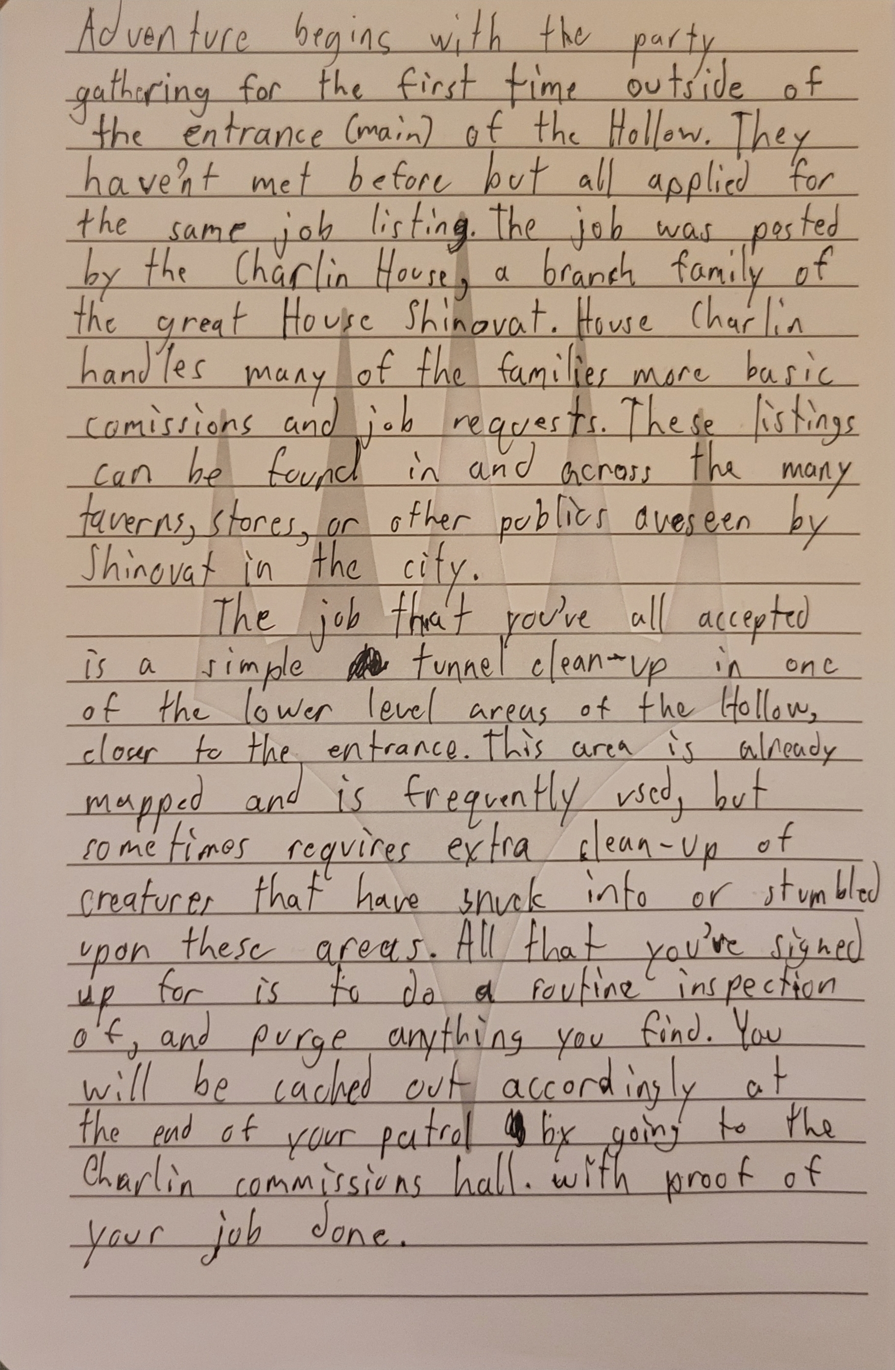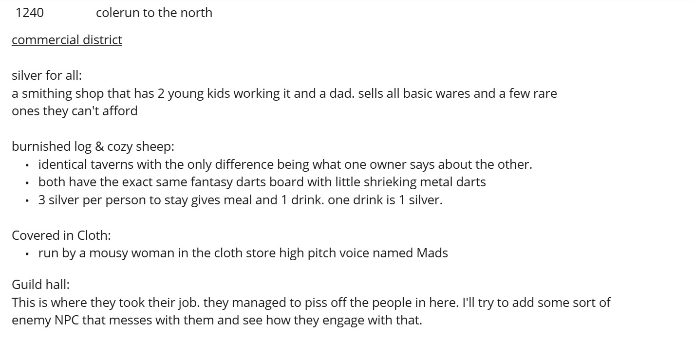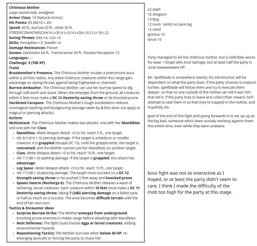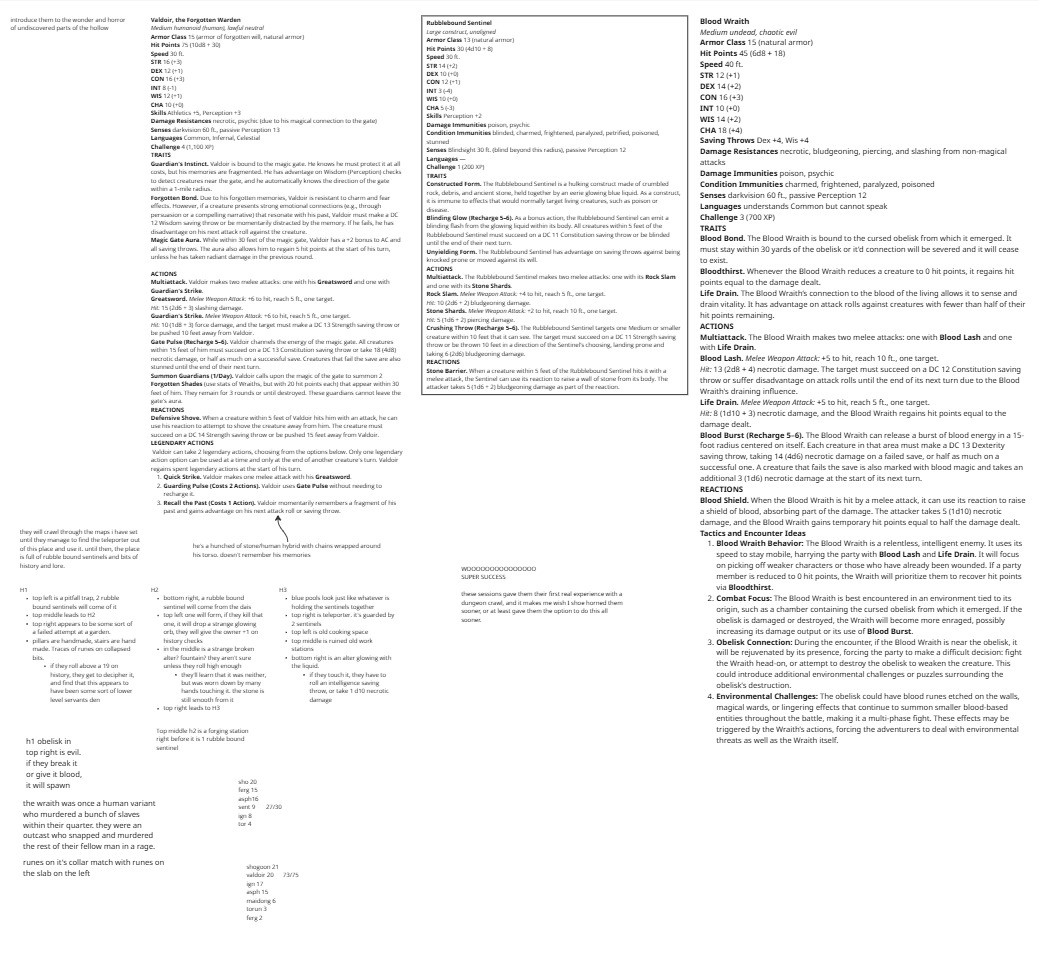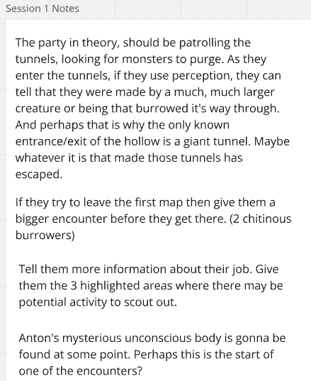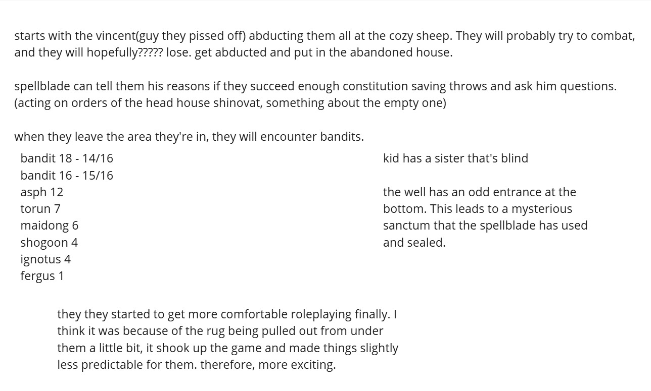 Thus began the long, iterative process of playtesting different approaches to encourage player engagement, role-playing, and excitement for the game. I ran a session every week, and with each one, I tested various methods. The biggest challenge in the design process was figuring out how to help first-time players better want to engage with the game mechanics and world. My goal was to find the “cure-all” method—one that was most universally successful—that I could implement early in the module to improve player engagement and excitement in future campaigns. The methods I explored were all sourced from research, including reading both official and homebrew modules Above are some of the notes I took during sessions.