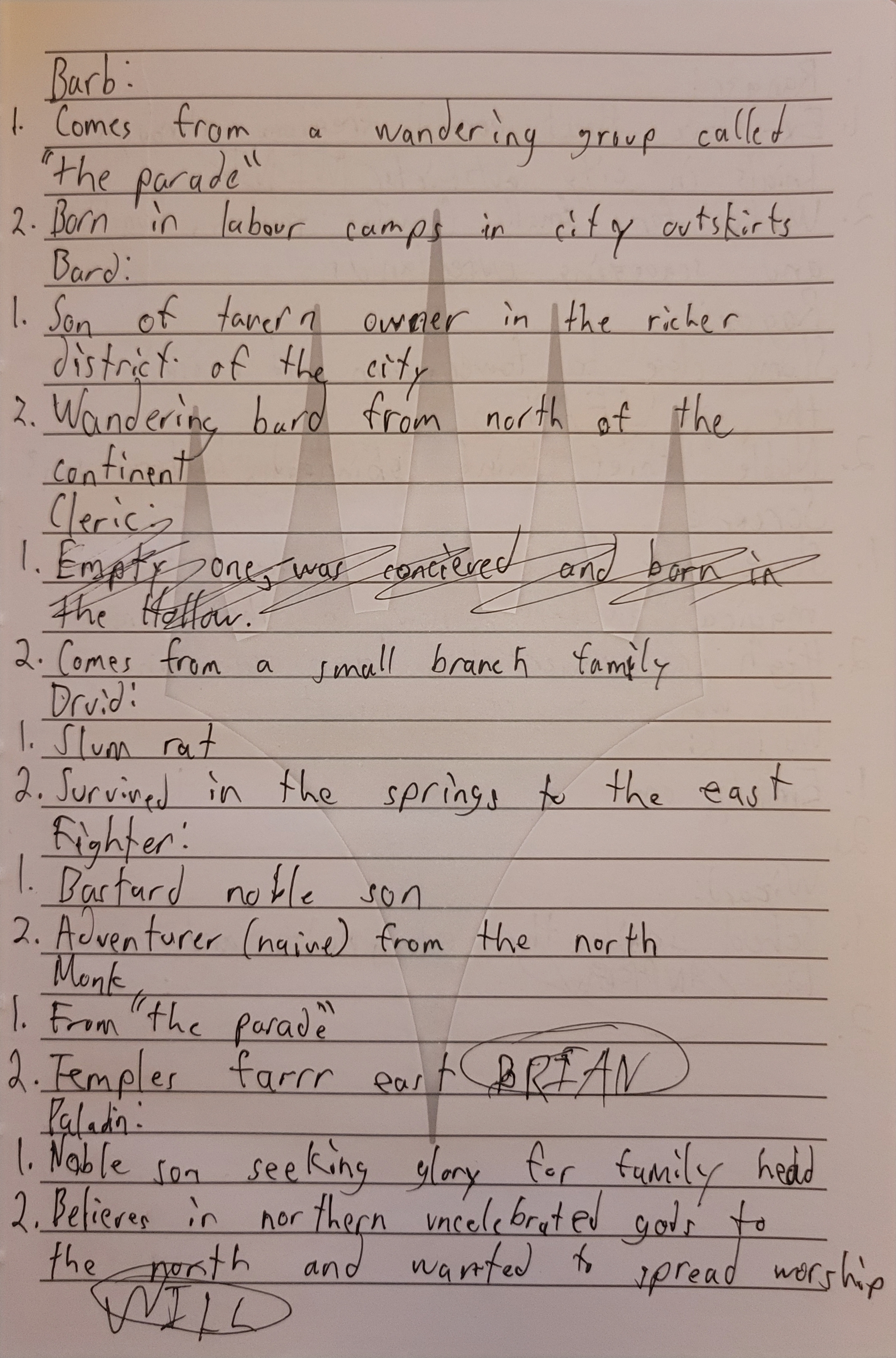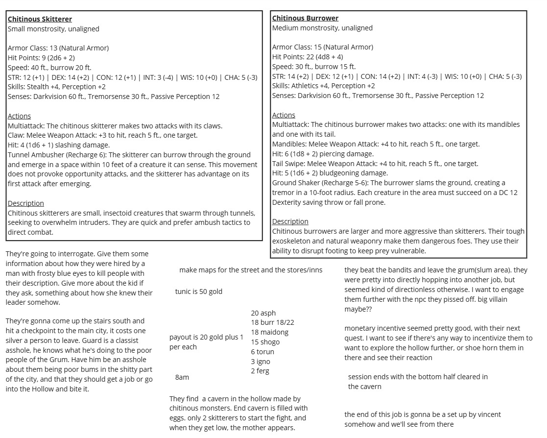 Building on these initial notes, I expanded character backstories into a structured, choice-based system that players could engage with right away. For every class, I wrote two unique backstory options tailored to fit a variety of play styles and personalities. The ones chosen by my players are shown above. This approach was meant to minimize prep time and reduce the intimidation factor of starting from scratch—allowing the game to begin as quickly as possible.