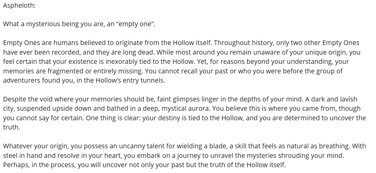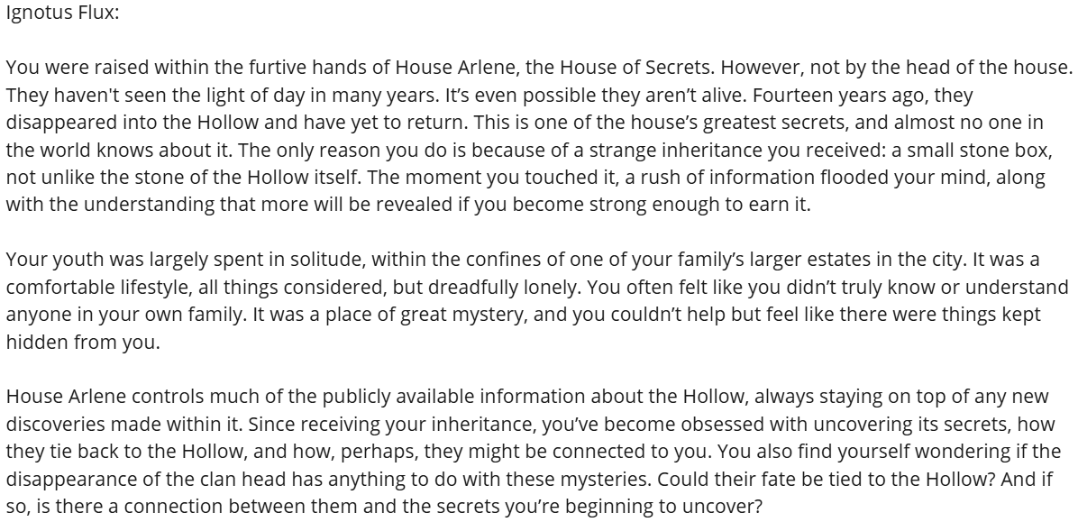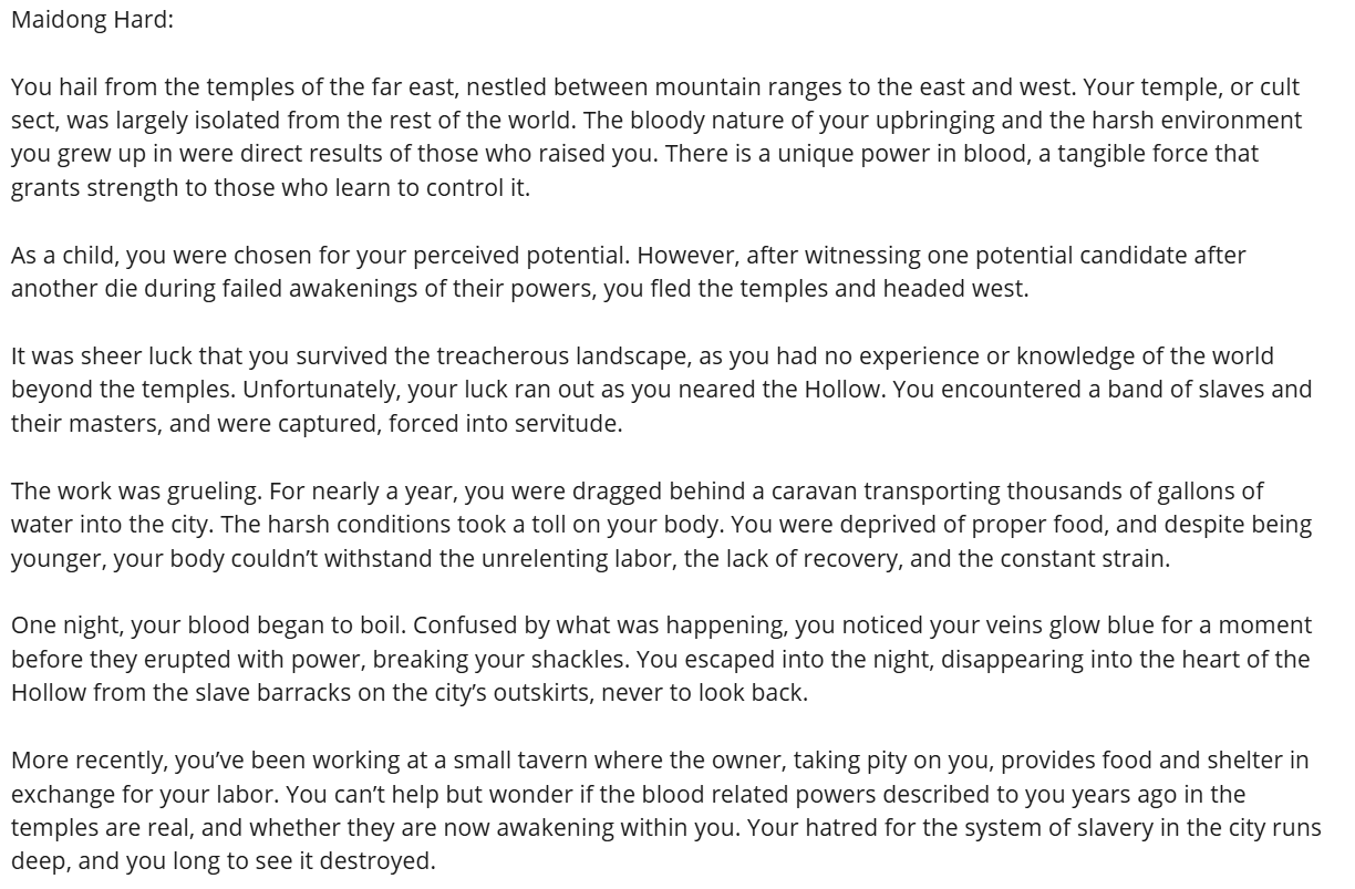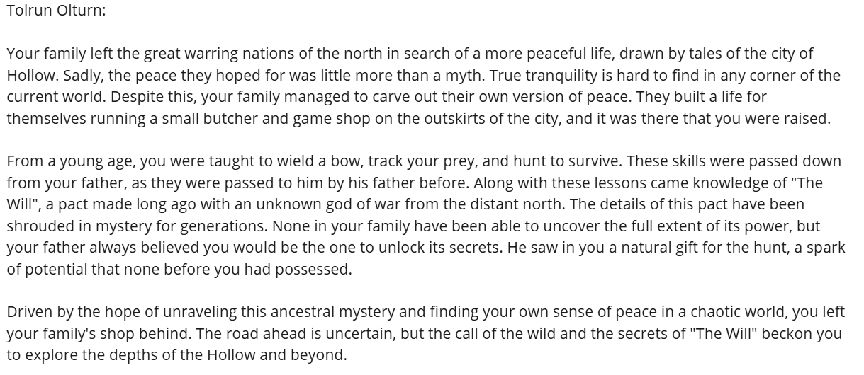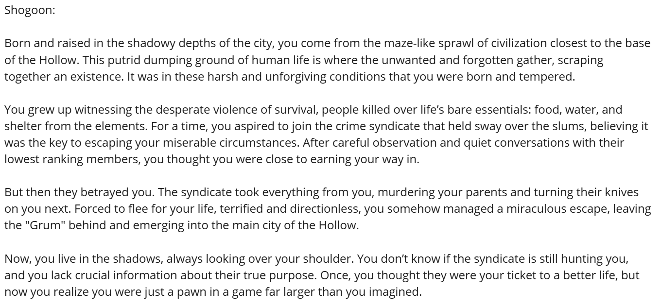 Once a player selects a backstory, they receive a more detailed character sheet that includes personalized notes: motivations, personality traits, goals, and even hidden secrets specific to their chosen identity. The goal of these additions was to not only speed up the onboarding process, but also give players a strong narrative foundation to roleplay from, helping them feel immersed and invested from the moment the game begins.