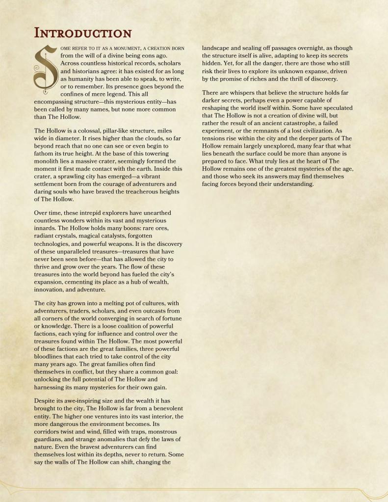 The Heights of the Hollow is a beginner-focused Dungeons & Dragons campaign module designed with user experience at its core. this project reimagines how new players interact with tabletop roleplaying by streamlining the onboarding process—from character creation to in-game decision-making. Every design choice prioritizes clarity, accessibility, and engagement, helping first-time players navigate complex mechanics through intuitive layouts, guided instructions, and worldbuilding that invites exploration without overwhelming. By removing common barriers to entry, The Heights of the Hollow transforms what is often a daunting first step into an inviting and memorable adventure.