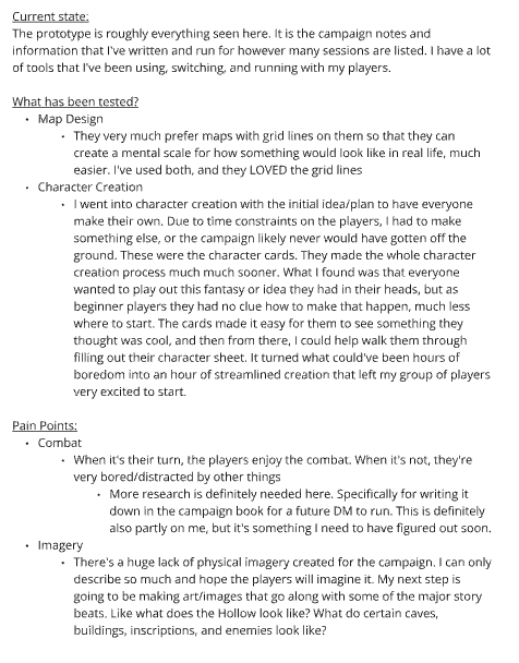 To playtest the campaign, I gathered a group of six friends who had never played Dungeons & Dragons before. Their feedback and firsthand experiences were essential in identifying pain points, refining the onboarding process, and shaping the overall user experience.
